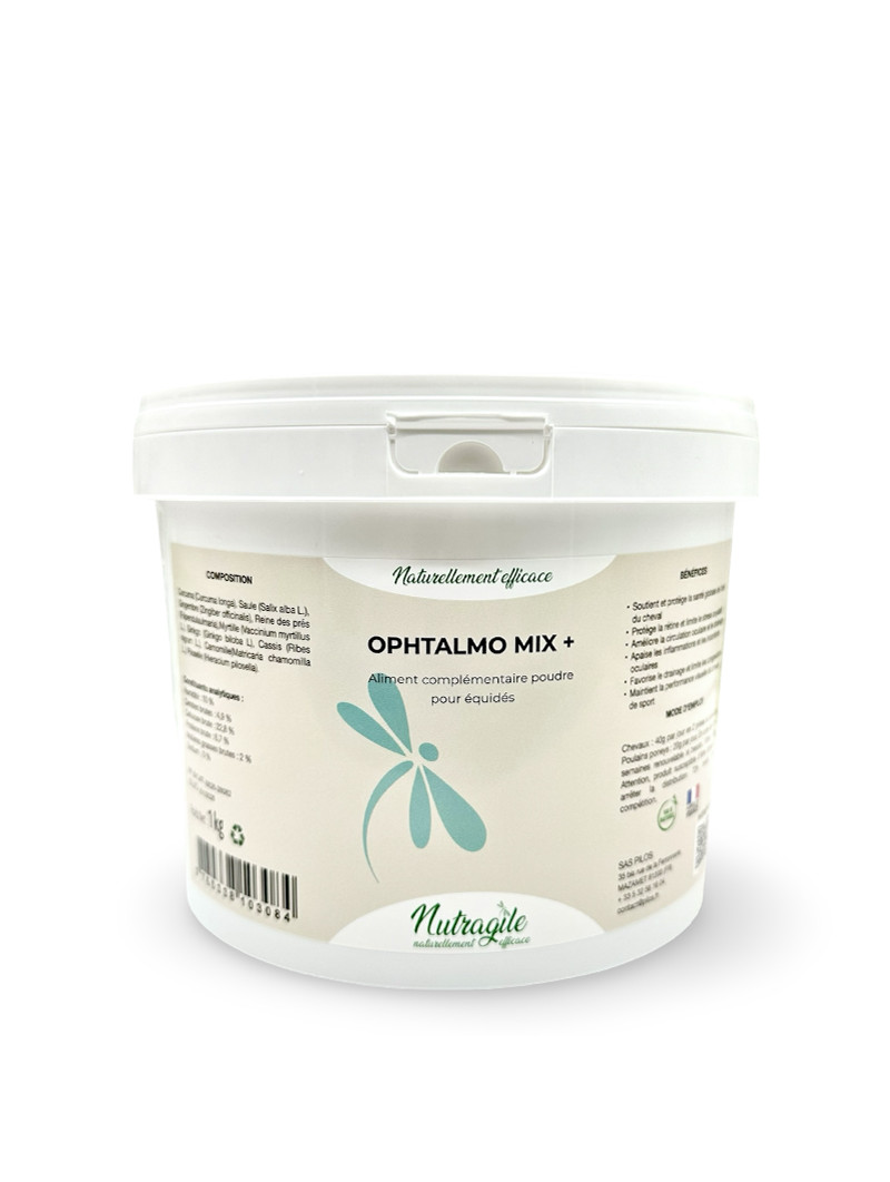 Grâce à la synergie unique du curcuma, gingembre, reine-des-prés, myrtille, ginkgo, cassis et piloselle, Ophtalmo Mix + offre un soutien global de la santé oculaire du cheval.